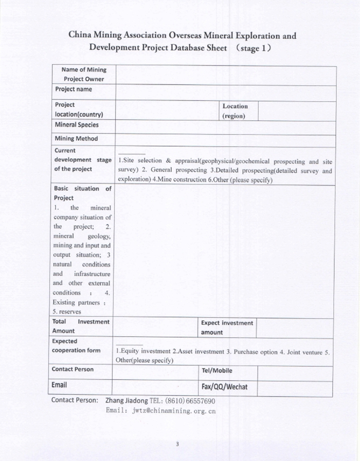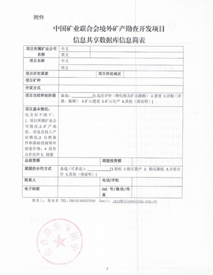為推進落實國家“一帶一路”戰略,服務自然資源部打造信息公共服務平台,精準支撐“走出去”工作,同時為更好地促進國內外礦業信息共享,促成境外礦產項目、資金對接合作,推動礦業國際產能合作,我會正積極開展境外礦產勘查開發項目信息共享數據庫建設。現商情各單位提供相關境外礦業項目信息(詳細需求見附件),在此工作基礎上,我會將根據企業需求舉辦項目推介會、安排中國國際礦業大會項目對接合作洽談、組織有投資意向的中方投資者進行項目實地考察等,進一步為投資者與礦業權人對話與合作提供務實服務。