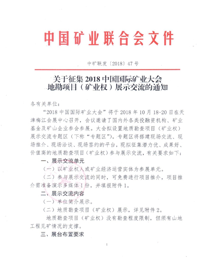關於征集2018中國國際礦業大會地勘項目(礦業權)展示交流的通知