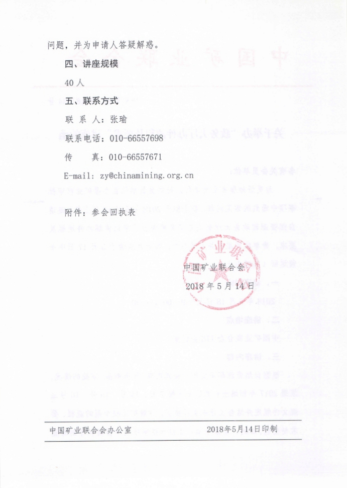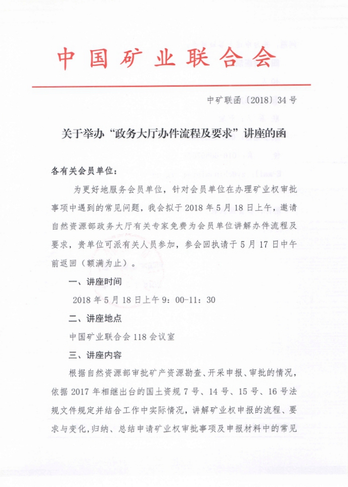 為更好地服務會員單位,針對會員單位在辦理礦業權審批事項中遇到的常見問題,我會擬於2018年5月18日上午,邀請自然資源部政務大廳有關專家免費為會員單位講解辦件流程及要求,貴單位可派有關人員參加, 具體內容如下: