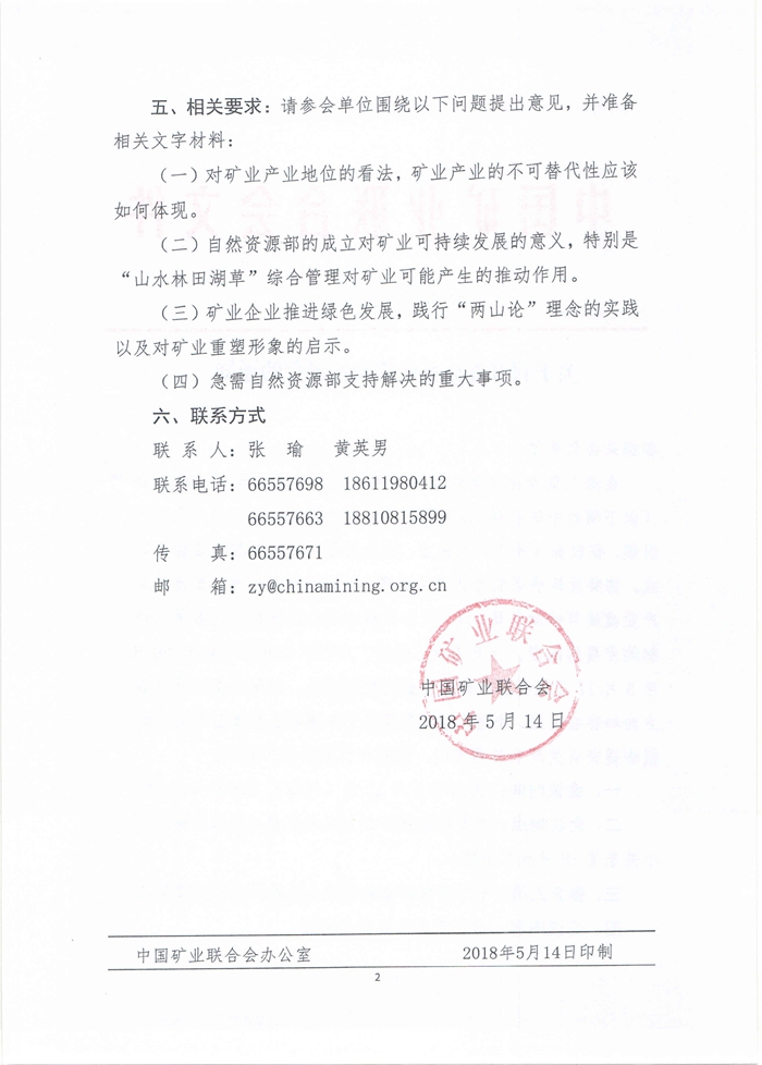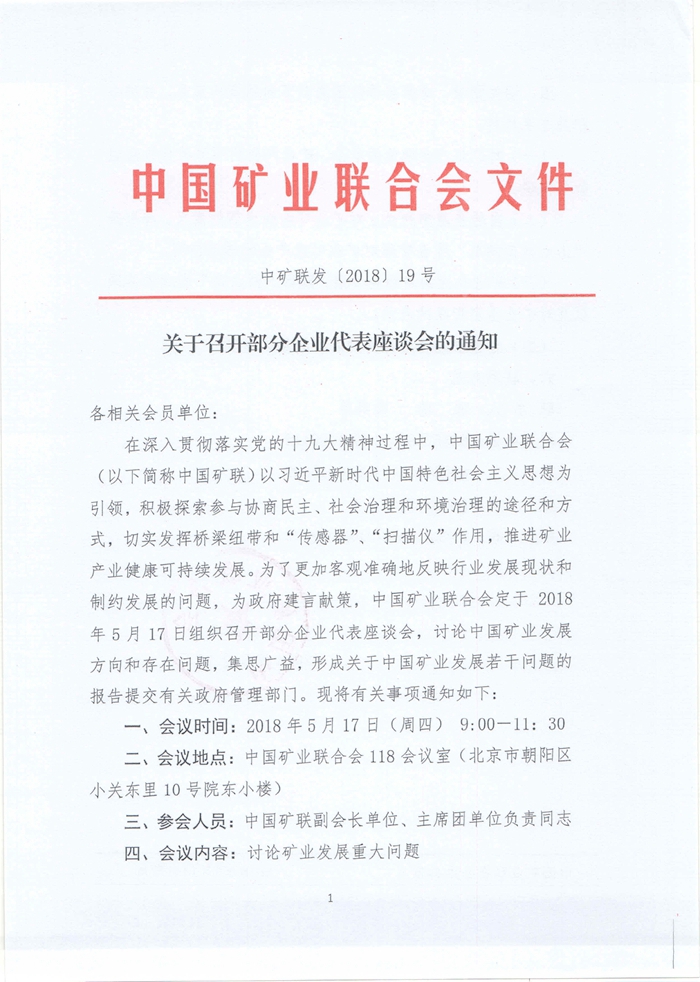 在深入貫徹落實黨的十九大精神過程中,米兰竞技足球俱乐部官网(以下簡稱中國礦聯)以習近平新時代中國特色社會主義思想為引領,積極探索參與協商民主、社會治理和環境治理的途徑和方式,切實發揮橋梁紐帶和“傳感器”、“掃描儀”作用,推進礦業產業健康可持續發展。為了更加客觀準確地反映行業發展現狀和製約發展的問題,為政府建言獻策,米兰竞技足球俱乐部官网定於2018年5月17日組織召開部分企業代表座談會,討論中國礦業發展方向和存在問題,集思廣益,形成關於中國礦業發展若幹問題的報告提交有關政府管理部門。現將有關事項通知如下: