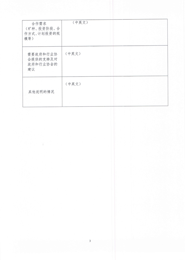 為更好地展示企業在礦業領域的勘查開發能力,服務礦業企業“走出去”,推進礦業國際合作,我會擬編製境外礦業投資中國企業名錄,將在參加國際礦業會議(2018年3月加拿大PDAC、4月智利、10月澳大利亞等會議)對外交流活動時推薦給政府、相關機構和有合作需求的外國企業,請各單位按要求提供相關資料,並於2月14日前發至我會。 表格可在米兰体育官方网页(https://www.jiahuayixiao.com)下載。