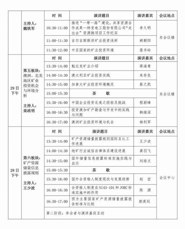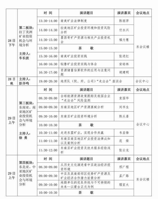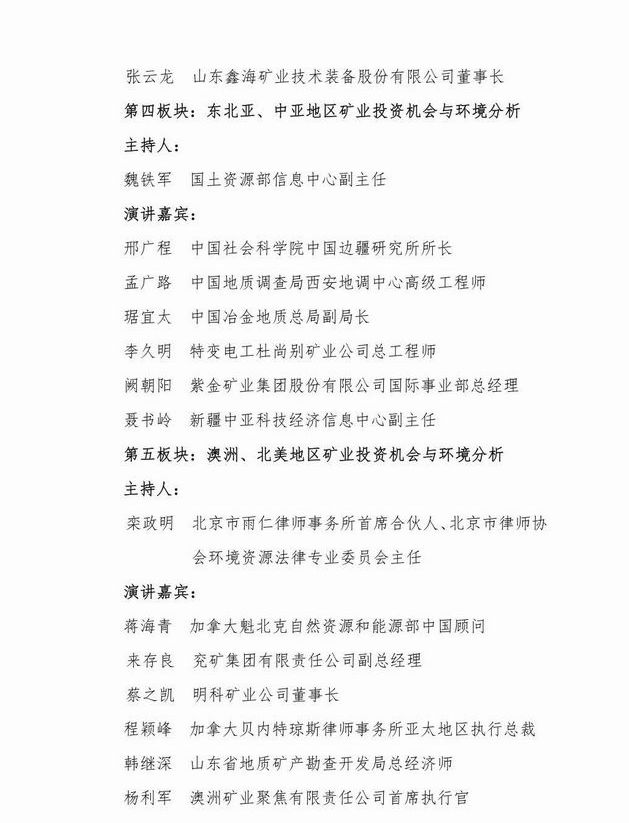 主旨論壇、分論壇第一板塊:非洲礦業投資機會與環境分析、第二板塊:拉丁美洲礦業投資機會與環境分析、第三板塊:東南亞、南亞地區礦業投資機會與環境分析、第四板塊:東北亞、中亞地區礦業投資機會與環境分析、第五板塊:澳洲、北美地區礦業投資機會與環境分析、第六板塊:礦產資源儲量信息披露規則分別由國土資源部原總工程師、米兰竞技足球俱乐部官网會長彭齊鳴 ,國土資源部科技與國際合作司副司長白星碧,國土資源部中央地質勘查基金管理中心主任車長波,中國地質調查局發展研究中心主任徐勇,國土資源部信息中心副主任魏鐵軍,北京市雨仁律師事務所首席合夥人、北京市律師協會環境資源法律專業委員會主任欒政明,國土資源部礦產資源儲量司副司長王少波主持。