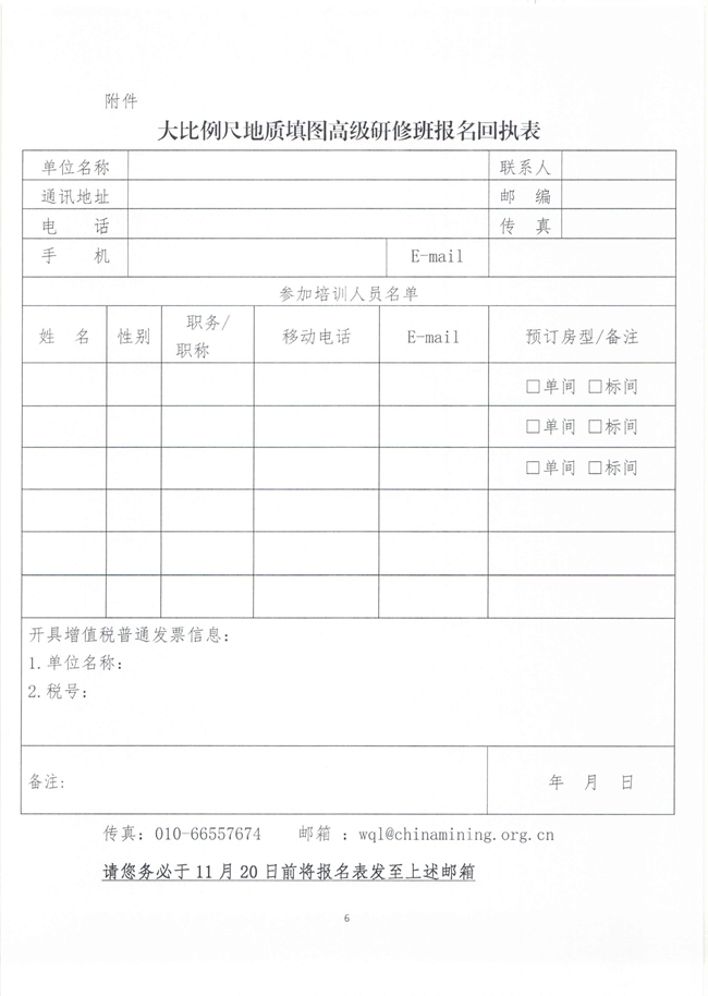 請填寫《大比例尺地質填圖高級研修班報名回執表》(見通知附件),並於11月20日前傳真或發至上述郵箱,以便安排住宿。