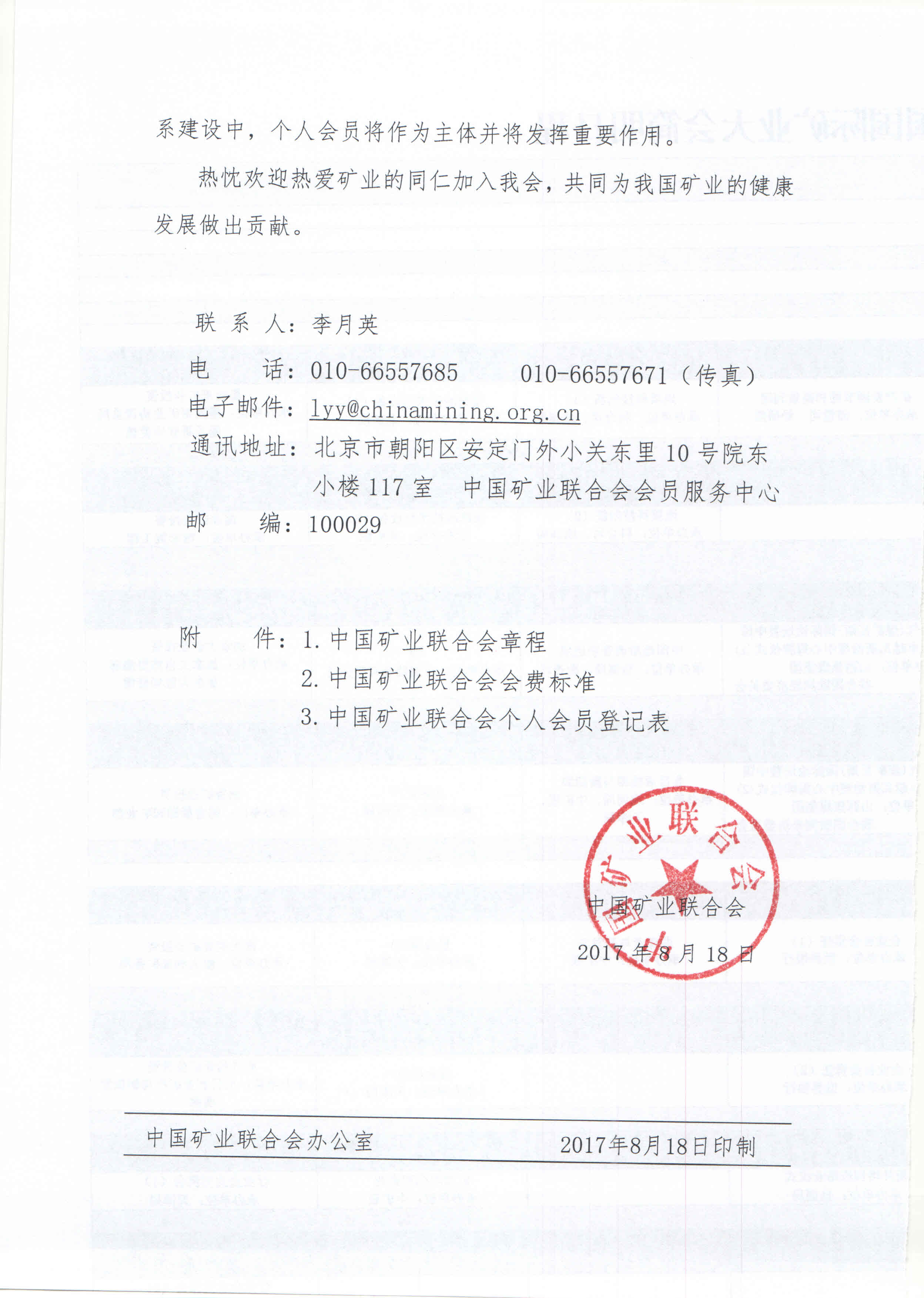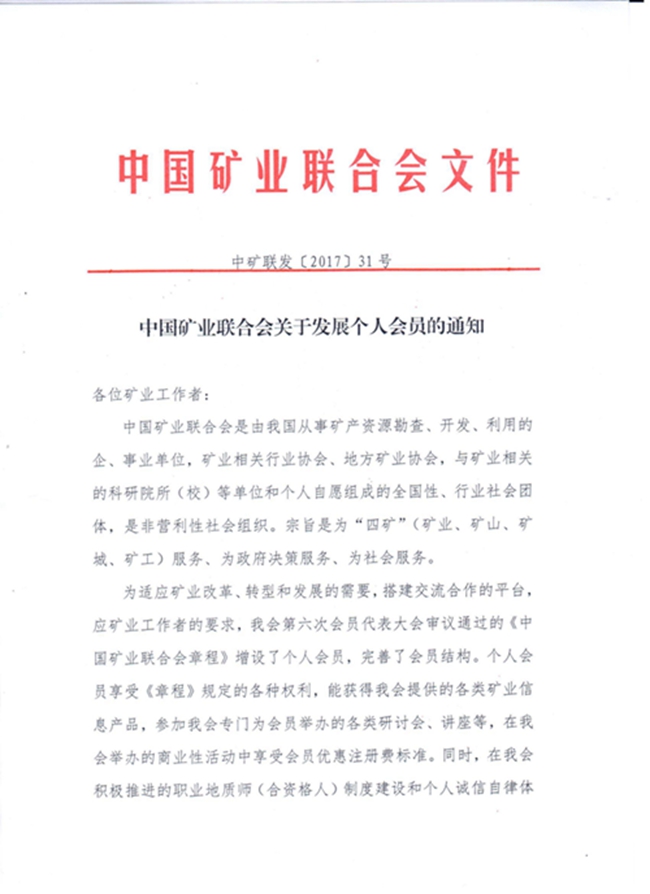 為適應礦業改革、轉型和發展的需要,搭建交流合作的平台,應礦業工作者的要求,我會第六次會員代表大會審議通過的《米兰竞技足球俱乐部官网章程》增設了個人會員,完善了會員結構。個人會員享受《章程》規定的各種權利,能獲得我會提供的各類礦業信息產品,參加我會專門為會員舉辦的各類研討會、講座等,在我會舉辦的商業性活動中享受會員優惠注冊費標準。同時,在我會積極推進的職業地質師(合資格人)製度建設和個人誠信自律體係建設中,個人會員將作為主體並將發揮重要作用。