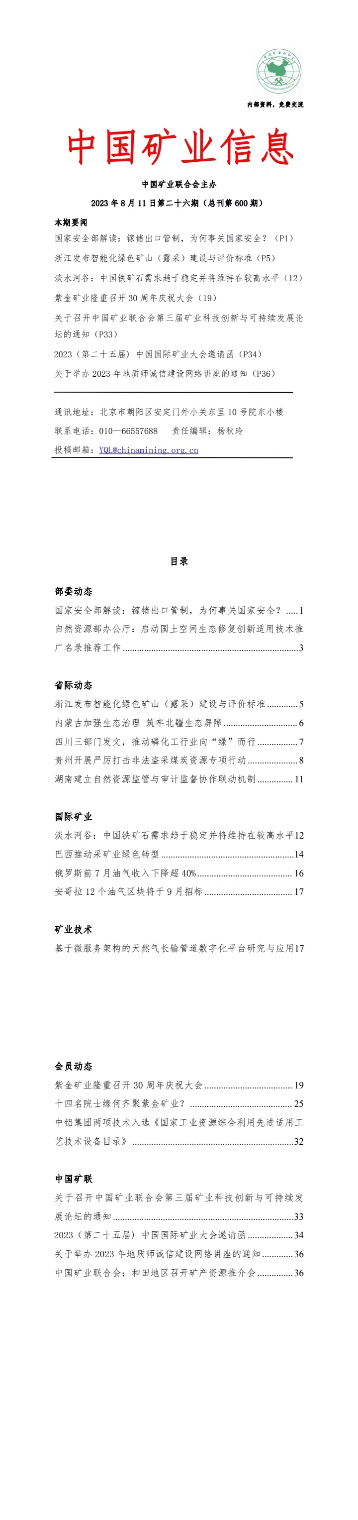 米兰体育官方网页:2023年8月7日—8月11日《中國礦業信息》第二十六期