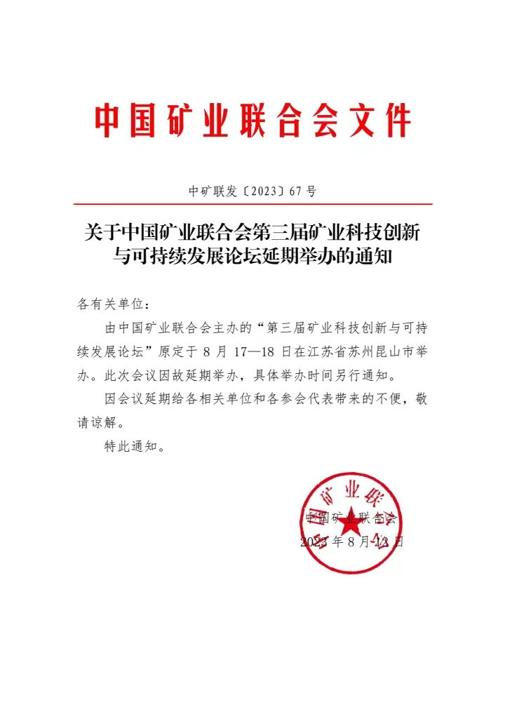關於米兰竞技足球俱乐部官网第三屆礦業科技創新與可持續發展論壇延期舉辦的通知_米兰竞技足球俱乐部官网_米兰体育官方网页 中國國際礦業大會