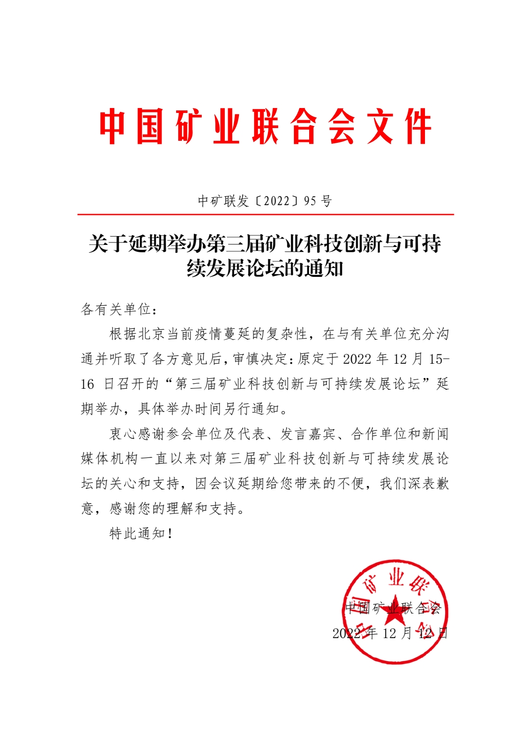 關於延期舉辦第三屆礦業科技創新與可持續發展論壇的通知_米兰竞技足球俱乐部官网_米兰体育官方网页 中國國際礦業大會